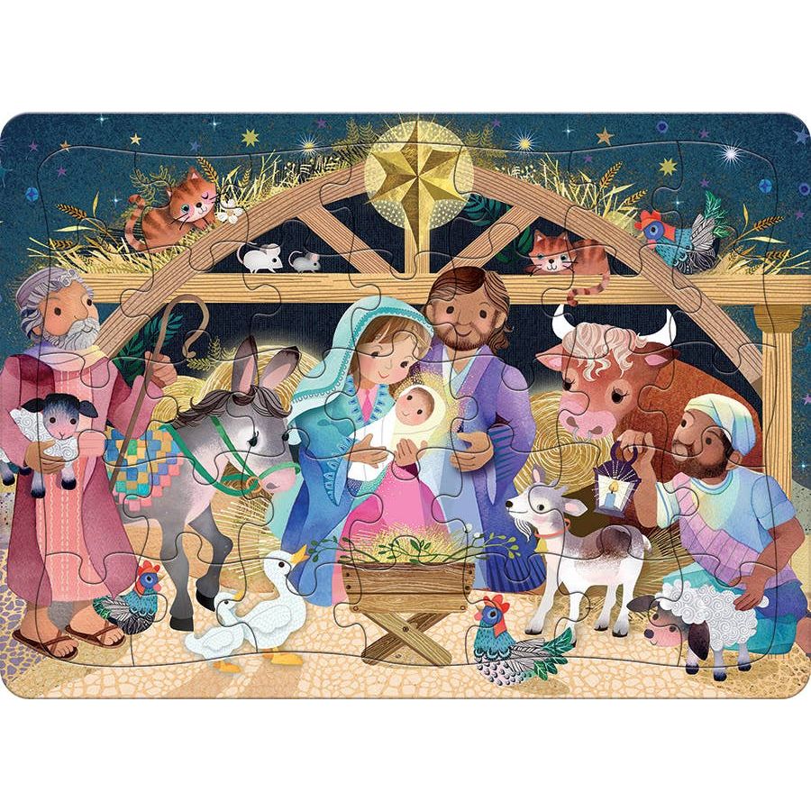 Celebrate the Nativity in a beautiful, accessible way with this A Child Is Born 35-piece tray puzzle. Baby Jesus rests in the manger, smiling up at Mary and Joseph as gentle animals gather around — a tender scene perfect for little hands and nostalgic hearts alike.
