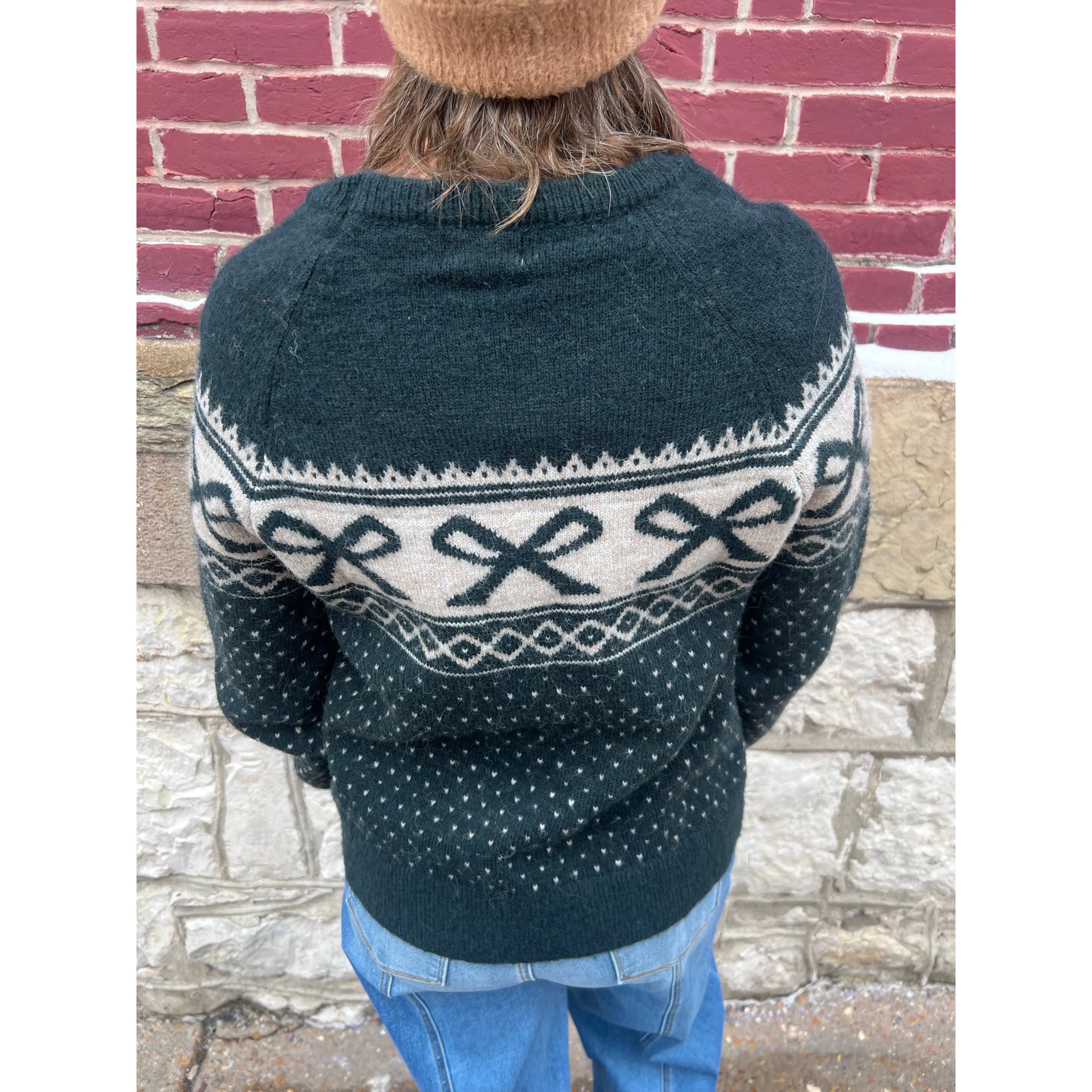 Charming, festive, and irresistibly cozy — this Holiday Bow Pattern Sweater captures the spirit of the season with playful detail and timeless knitwear style. A wide cream band stretches across the chest and upper sleeves, decorated with a cheerful repeat of red holiday bows. Just below, a slim geometric stripe adds a touch of classic winter patterning, while tiny cream dots are sprinkled throughout the vibrant red and green knit for a whimsical, snowfall-inspired effect.