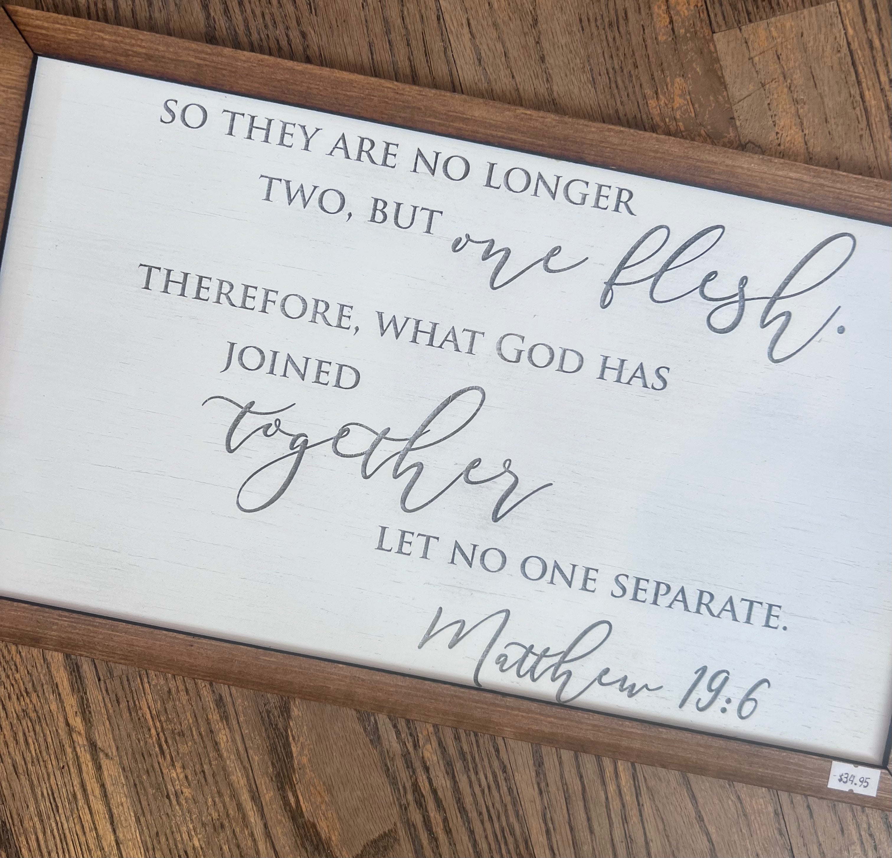 A meaningful piece that beautifully celebrates the covenant of marriage. This wood sign features the timeless scripture “So they are no longer two but one flesh.” — Matthew 19:6, making it a perfect reminder of unity, love, and commitment.