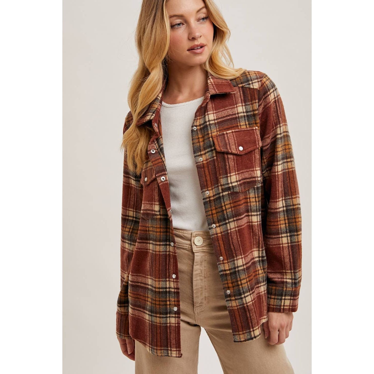 Effortlessly cozy and casually stylish — the Plaid Button-Down Shacket blends the warmth of a lightweight jacket with the easy, everyday feel of a classic shirt. Designed with a timeless plaid pattern, it brings rustic charm to any outfit while offering versatility for changing seasons. The soft fabric and relaxed, slightly oversized fit make it perfect for layering over a simple tee or pairing with a chunky sweater on cooler days.
