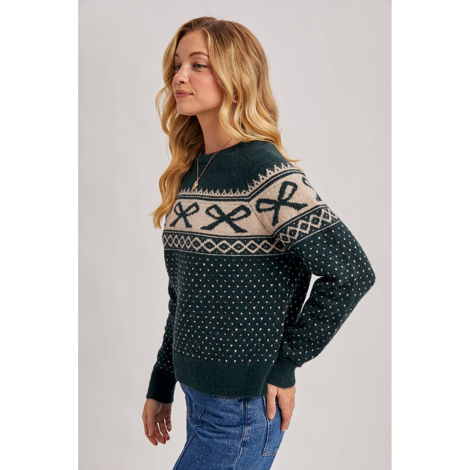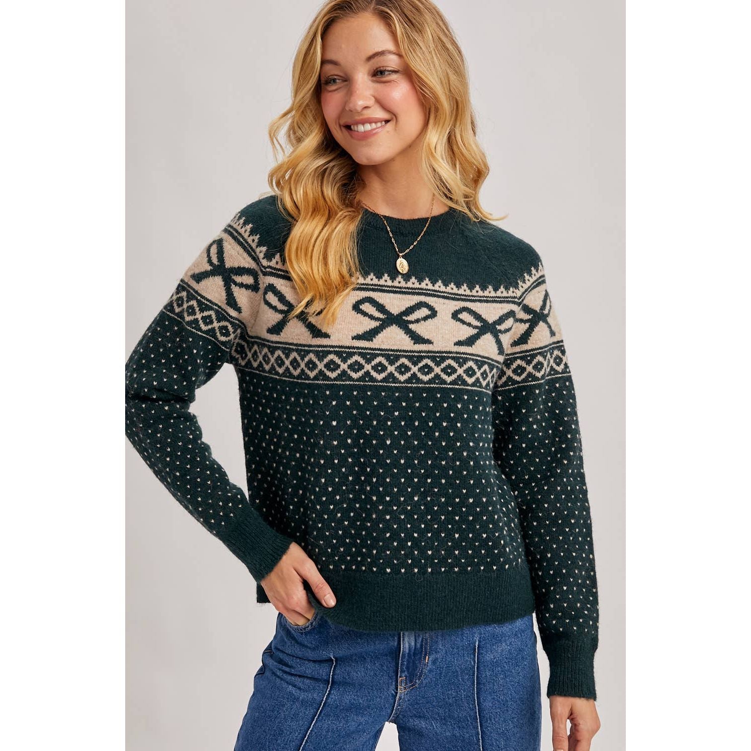 Charming, festive, and irresistibly cozy — this Holiday Bow Pattern Sweater captures the spirit of the season with playful detail and timeless knitwear style. A wide cream band stretches across the chest and upper sleeves, decorated with a cheerful repeat of red holiday bows. Just below, a slim geometric stripe adds a touch of classic winter patterning, while tiny cream dots are sprinkled throughout the vibrant red and green knit for a whimsical, snowfall-inspired effect.