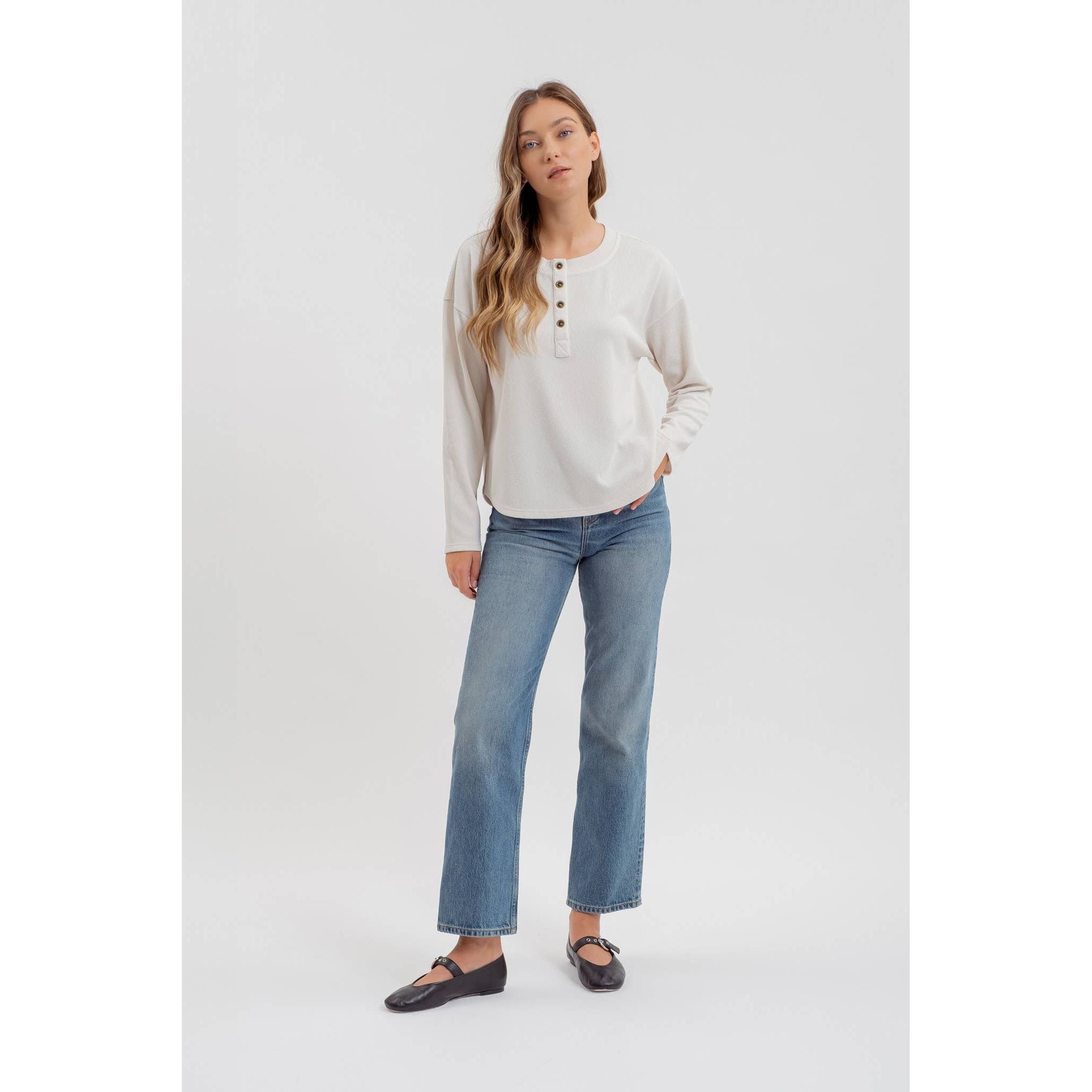 Casual, comfy, and effortlessly stylish — the Everyday Ease Henley Knit Top is the perfect everyday essential. Designed with a half button-down front, drop shoulders, and a relaxed fit, it offers that easygoing look you love with the softness you crave. The smooth knit fabric adds stretch for all-day comfort, making it ideal for layering or wearing on its own.