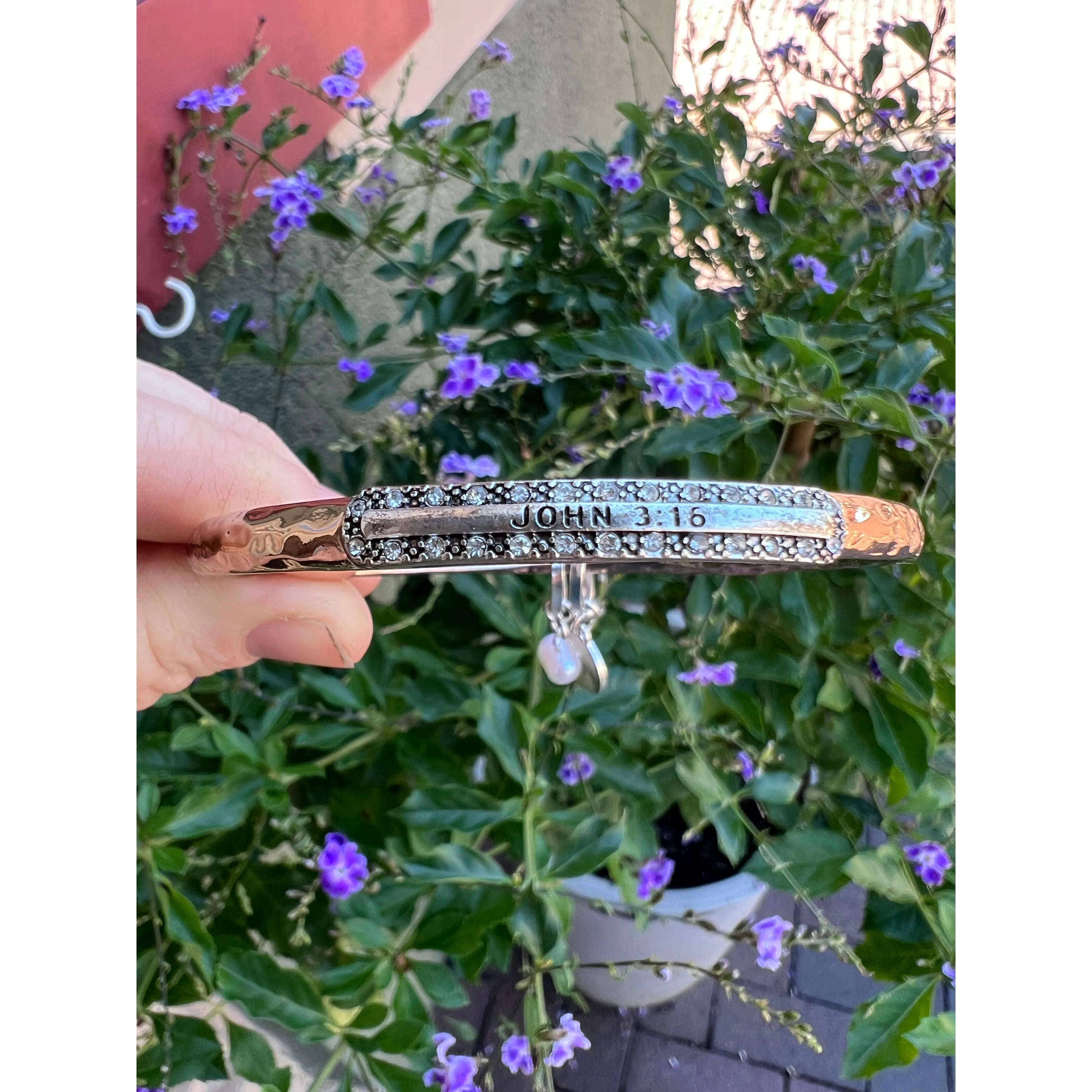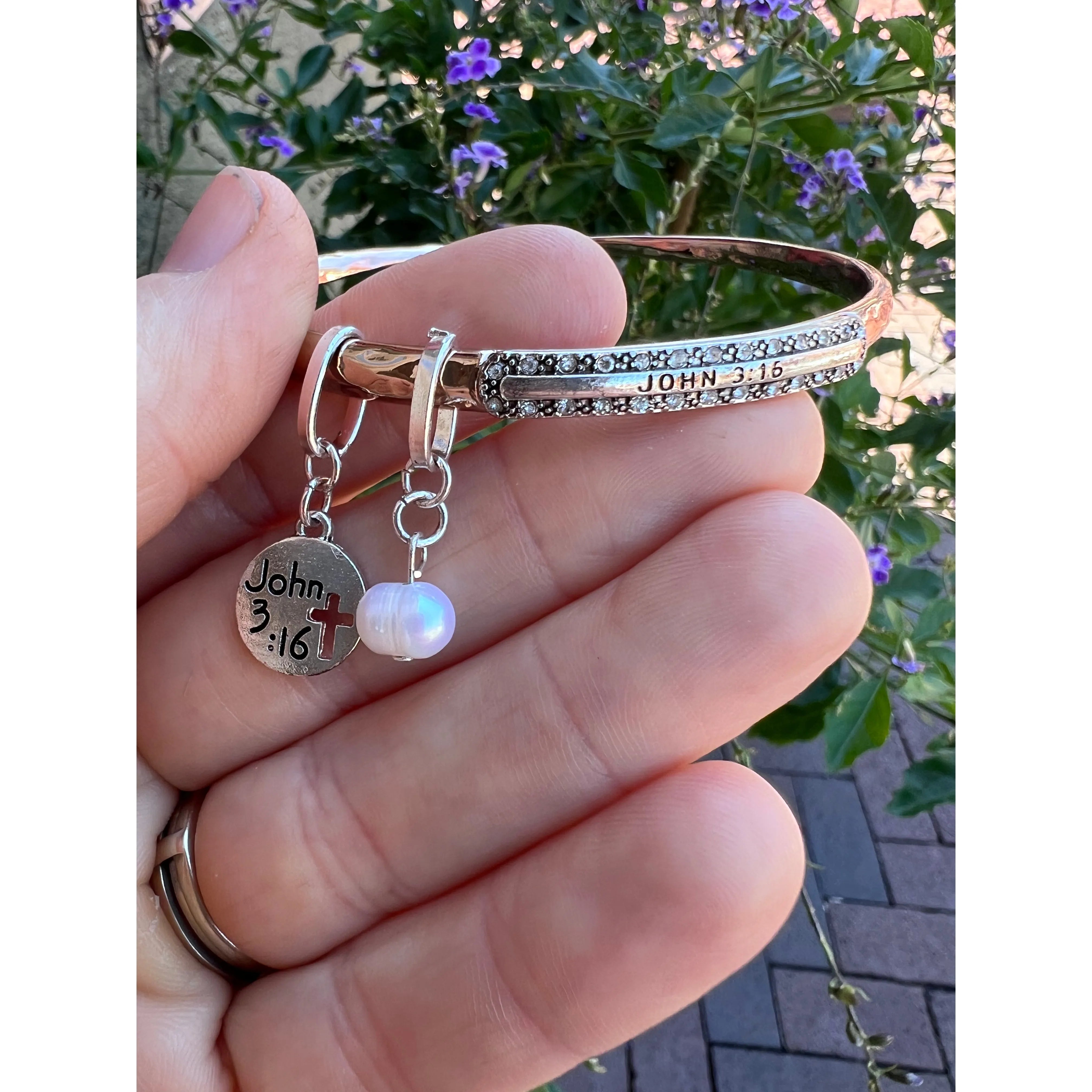 A beautifully layered expression of faith and style, the John 3:16 Mixed Metal Cuff Bracelet features a striking combination of hammered copper and antique silver finishes. Accented with delicate pearl charms, this meaningful piece blends texture, contrast, and timeless symbolism for a look that’s both bold and elegant.