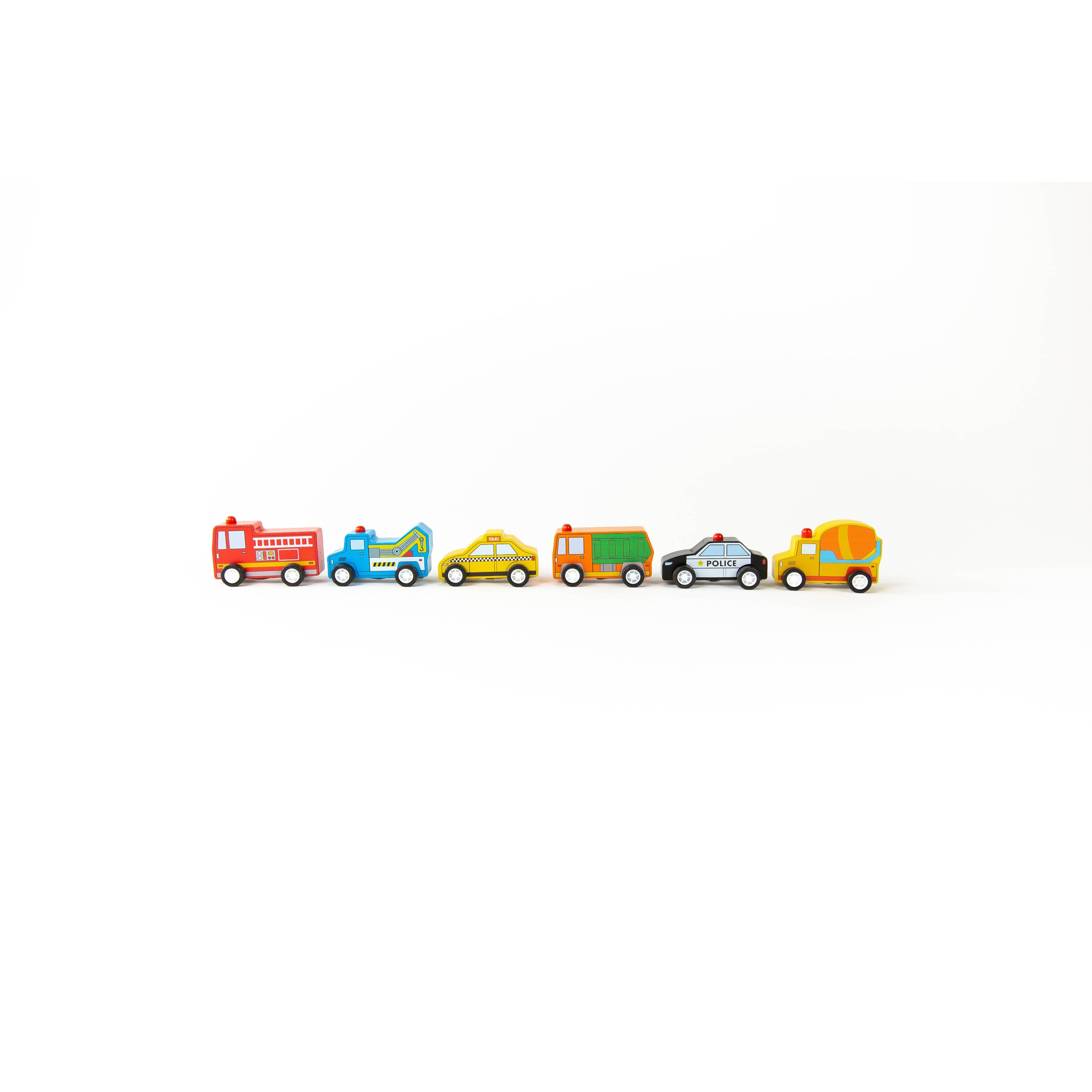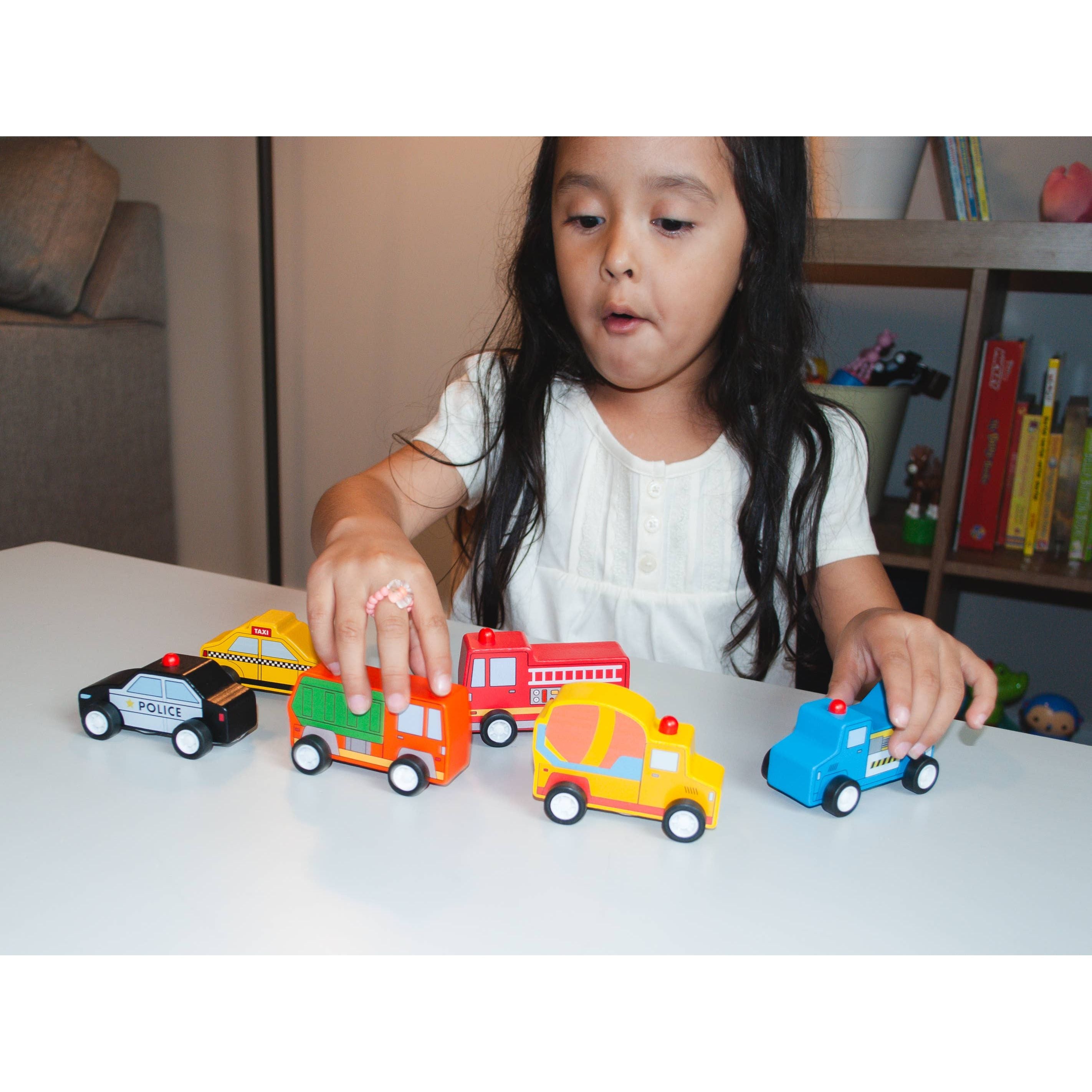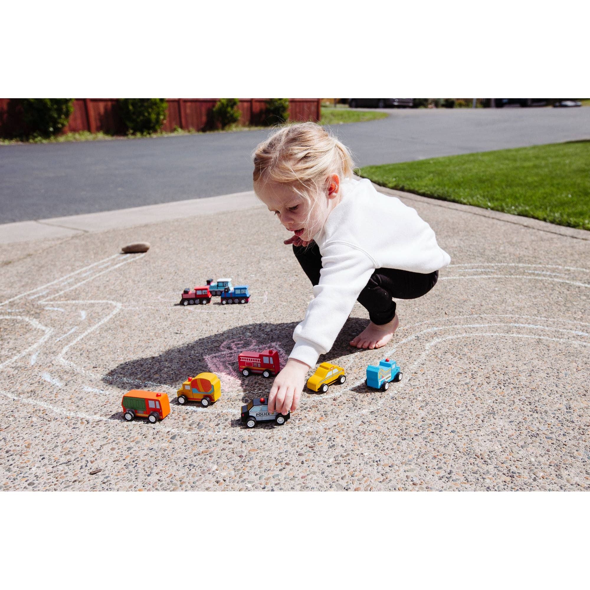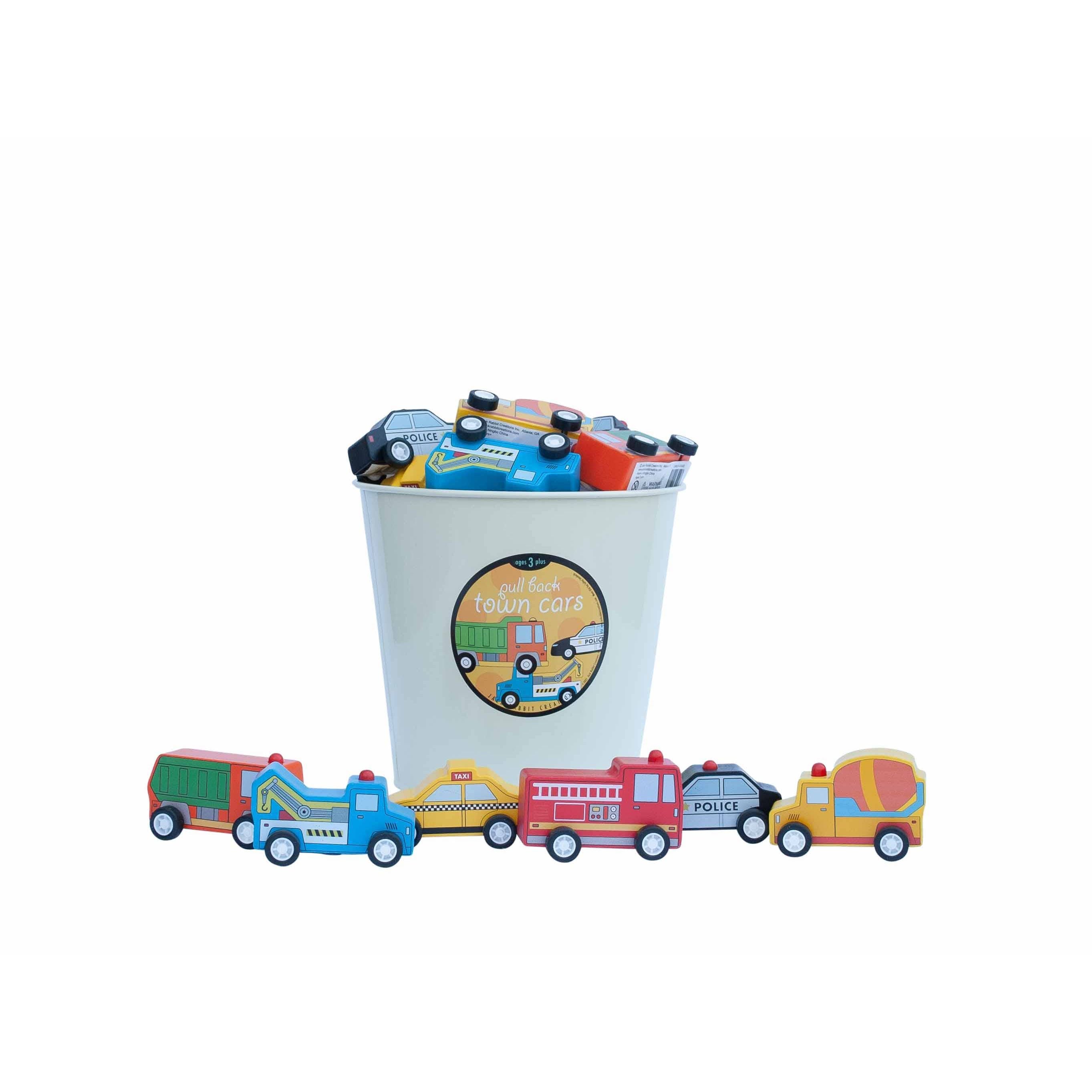 Ready, set, go! Our beloved Around the Town Cars are back with a fun twist—now featuring pull-back action and fresh new artwork. This charming wooden vehicle set keeps little ones racing through imaginative play, from fire rescues to city cleanups. Just pull them back and watch them zoom! Each set includes a fire engine, police car, taxi, tow truck, and sanitation truck—perfect for keeping your town on the move.