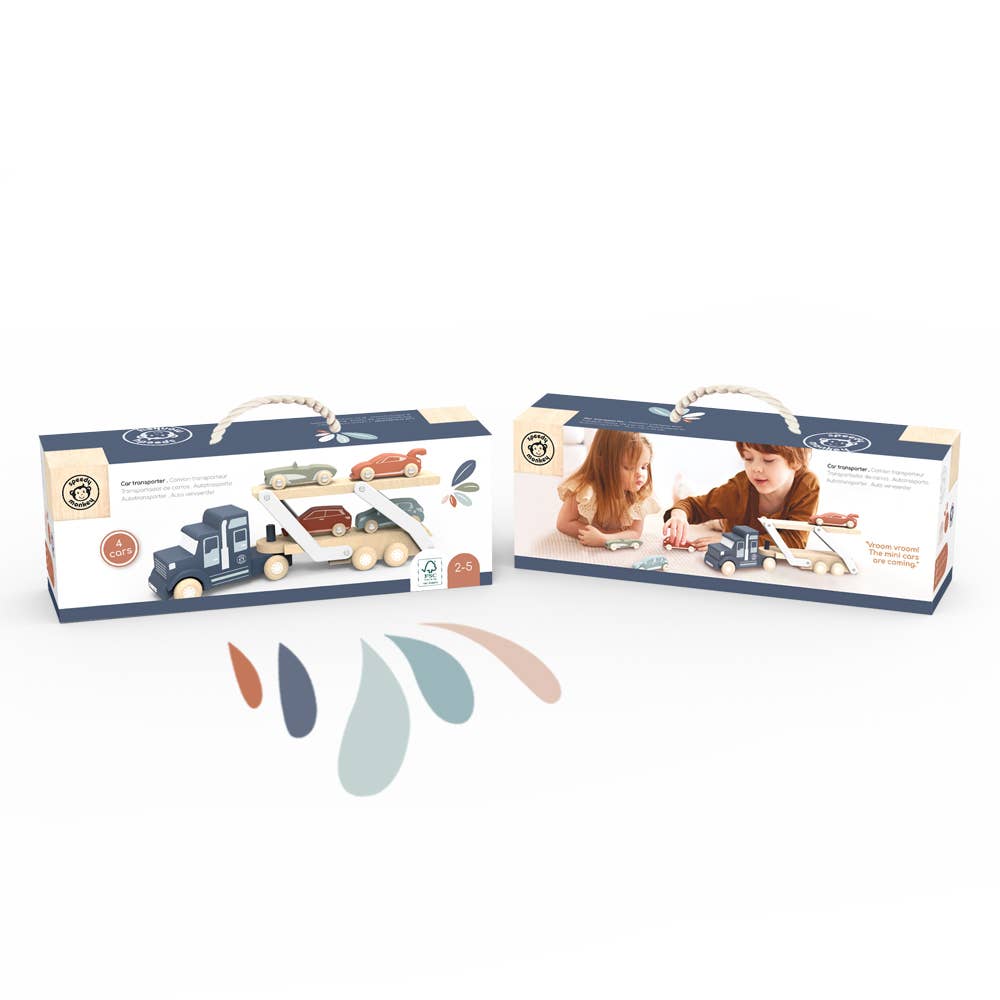 Designed for endless play and imaginative adventures, this wooden car transporter truck features a clever double-deck trailer that easily folds down for smooth loading and unloading. The set includes four colorful solid-wood cars—each sized perfectly for little hands—and secure slots on the trailer keep every vehicle in place while your little one races down imaginary roads.