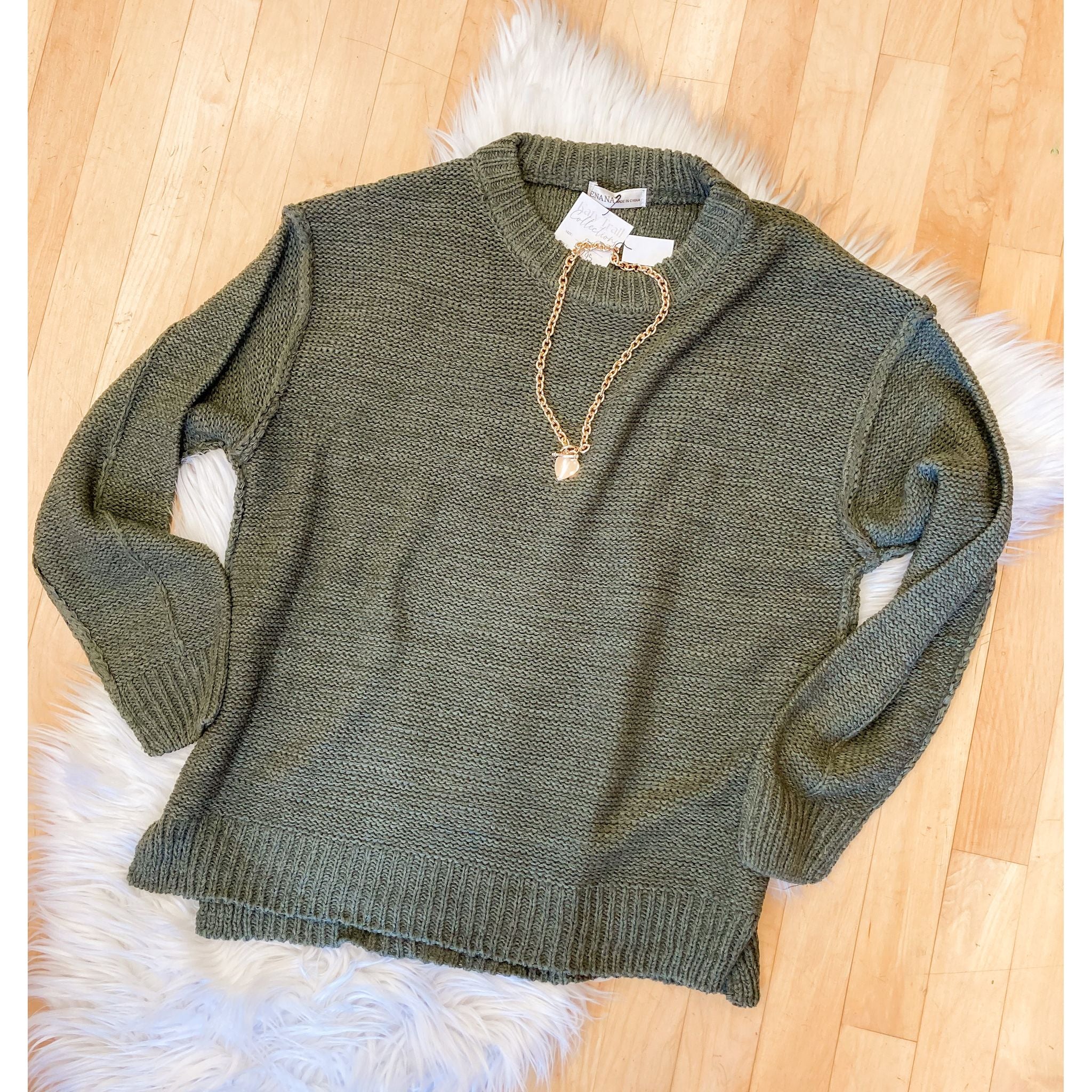 A cozy essential for the season — our Autumn Ridge Exposed Seam Sweater features a relaxed round neckline, subtle side slits, and raw seam detailing for that effortlessly lived-in look. The soft knit drapes beautifully in a rich dark olive hue, perfect for pairing with denim or layering over leggings. Comfy, casual, and timeless — your new go-to for cool fall days.