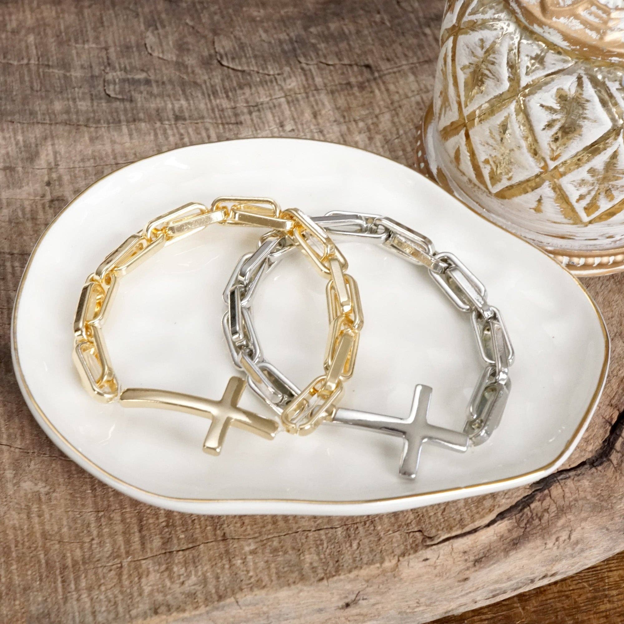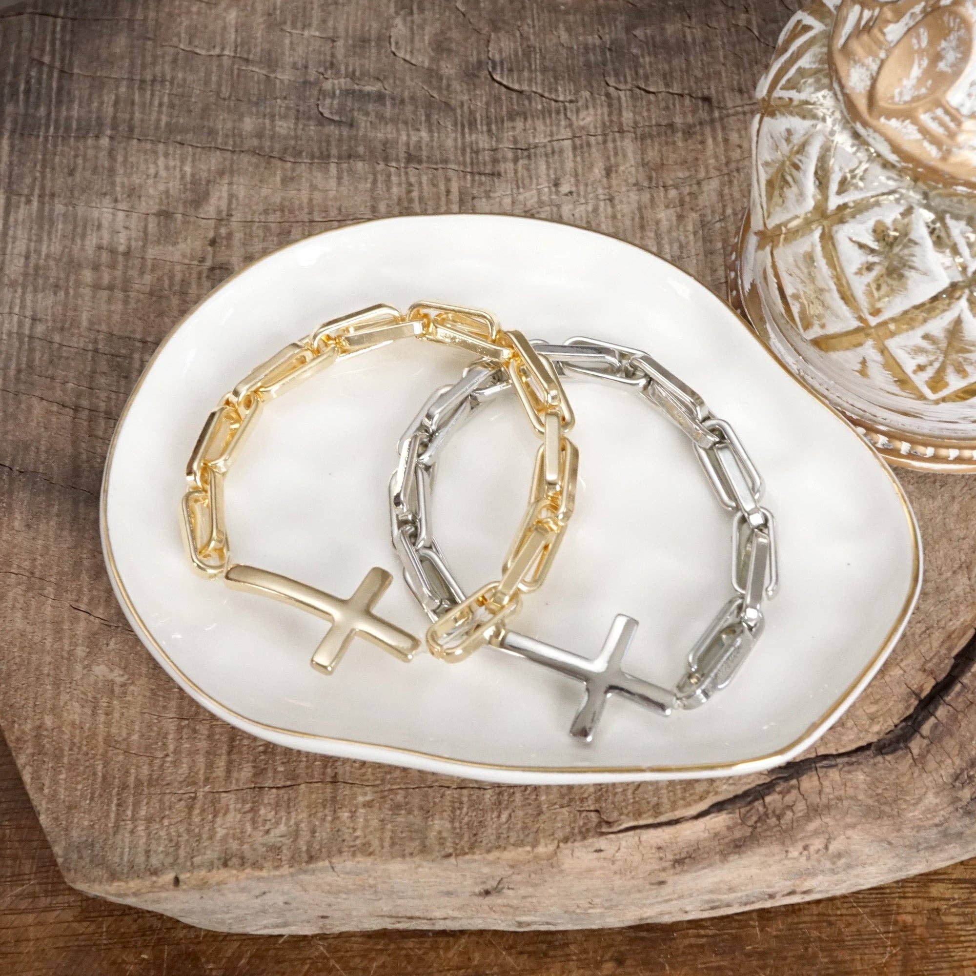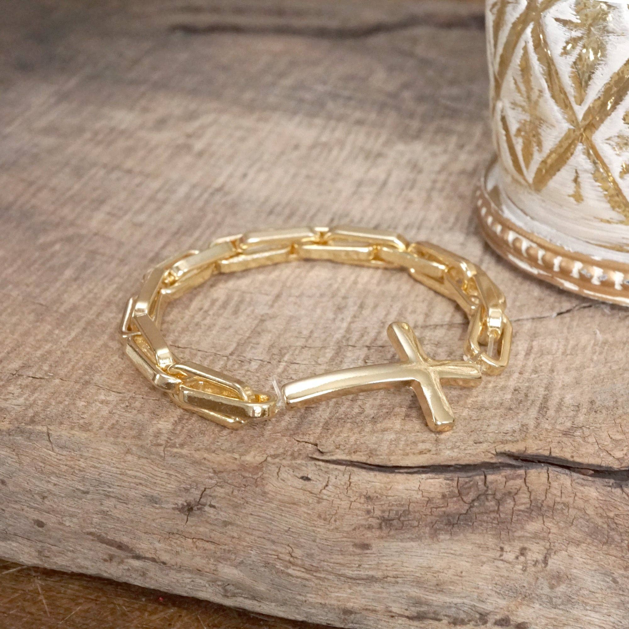 Clean, simple, and full of meaning—the Everyday Cross bracelet features a sleek sideways cross on a modern paperclip-style chain. With its easy stretch fit and choice of worn gold or silver tone, this piece is designed for effortless wear, whether layered or worn solo.