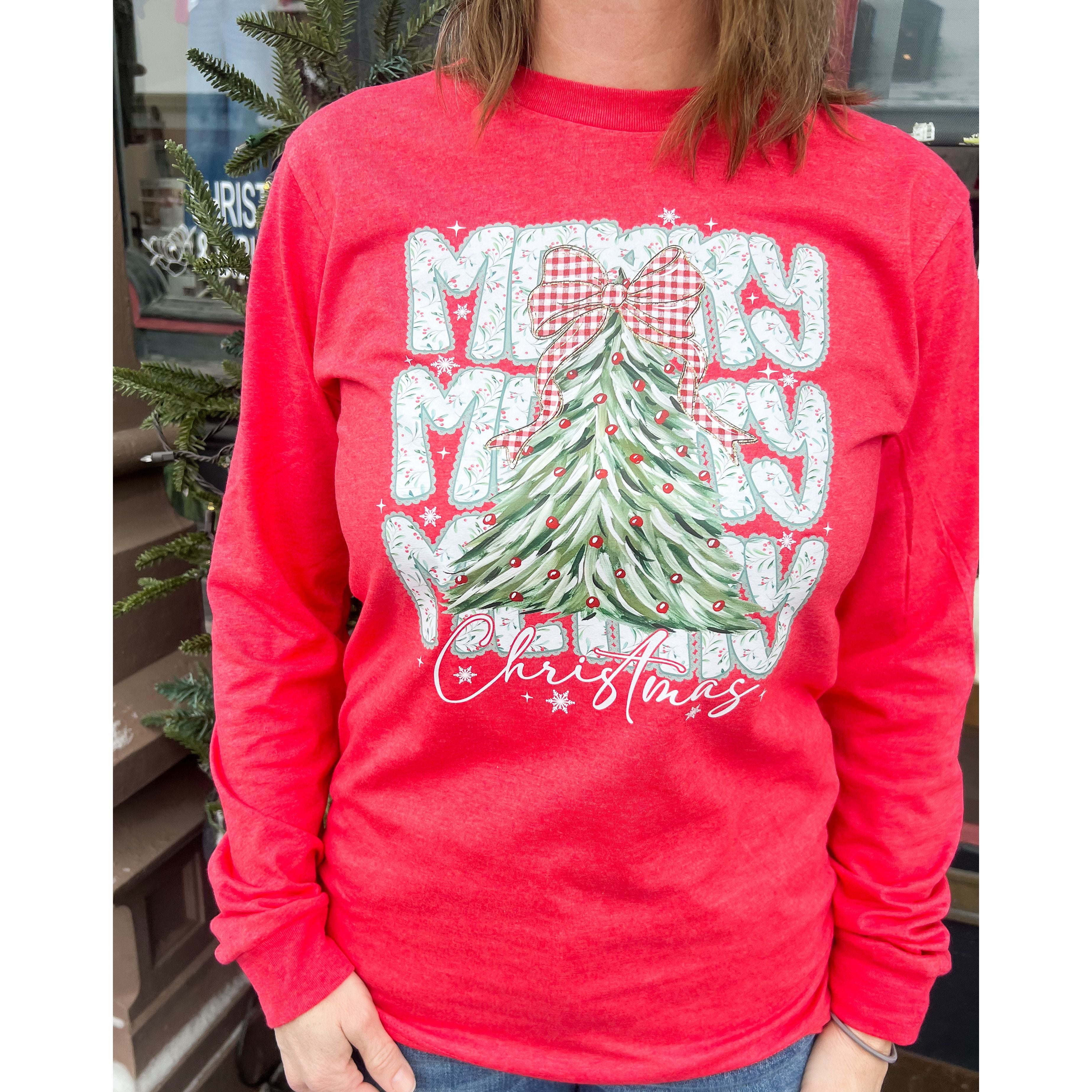 Merry Christmas Tree Heather Red Long Sleeve Tee | KT-247
