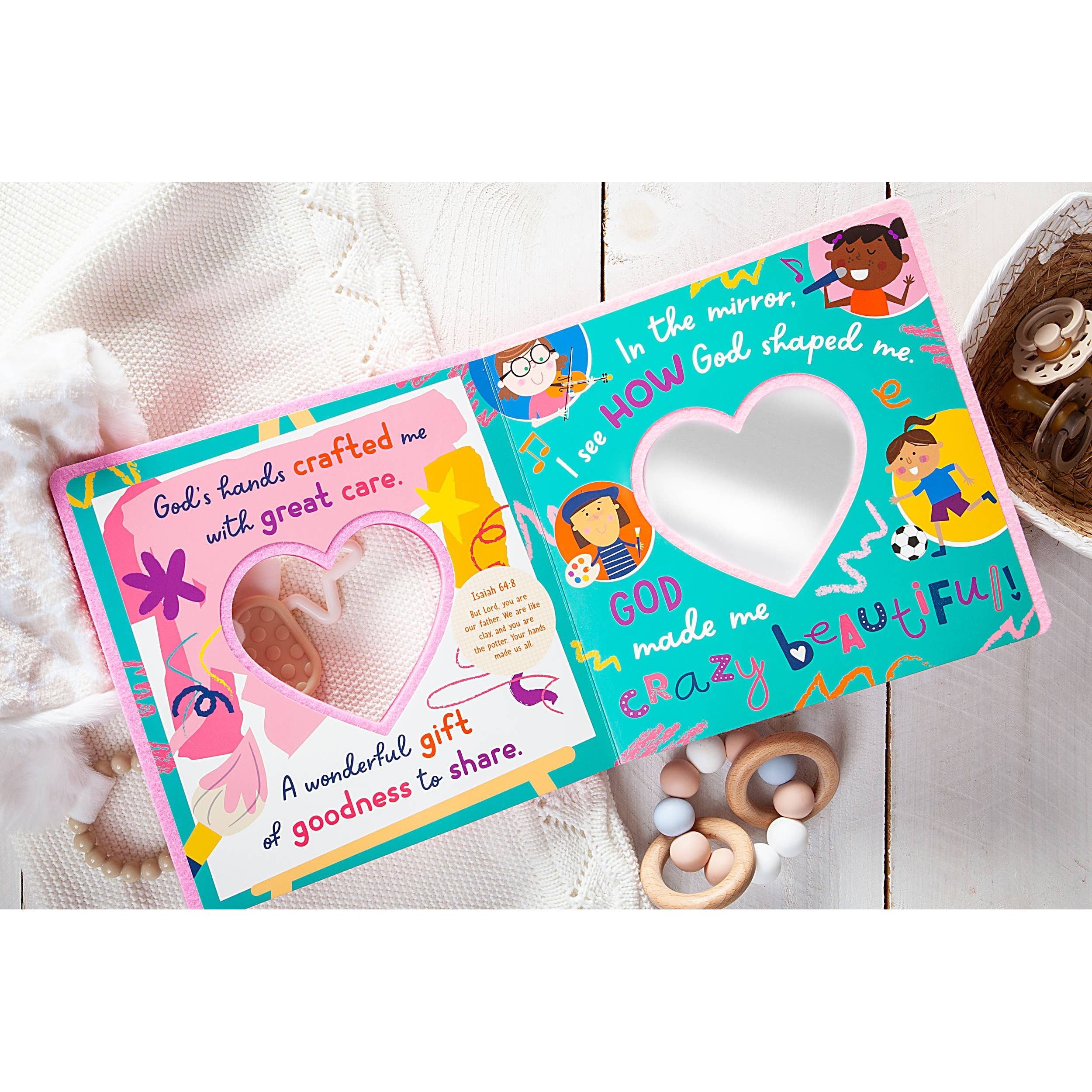 Celebrate God’s amazing creation — you! This charming board book helps little ones begin to understand their identity in Christ through gentle rhymes, Scripture, and playful interaction. Each page features a built-in mirror that shines through, allowing children to see themselves as wonderfully made by God. With soft felt-and-card pages and sweet, faith-filled verses, this book makes a heartfelt keepsake for storytime, bedtime, or anytime.