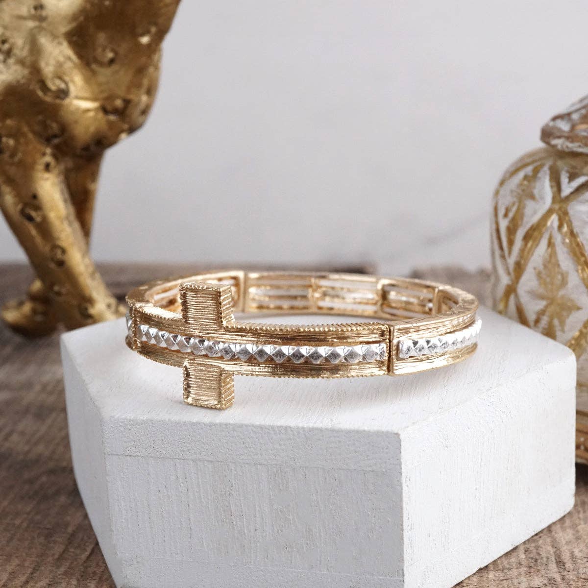 Subtle yet striking, this stretchy bangle blends warm gold tones with soft silver accents for a clean, modern look. The sideways cross offers quiet meaning, while the textured metal finish gives it a timeless feel. Lightweight and easy to wear, it’s the perfect piece to add understated elegance to your everyday stack.