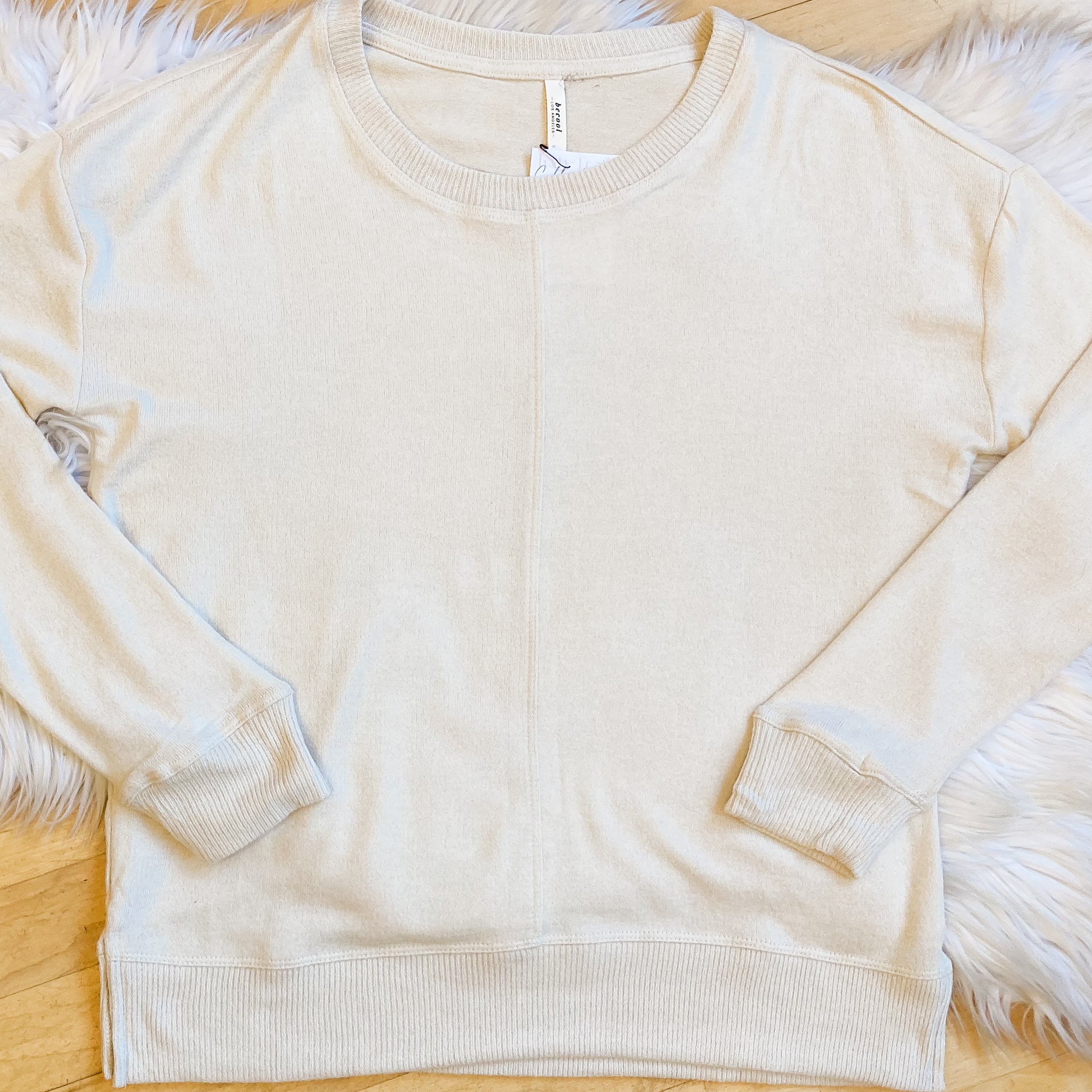 Wrap yourself in softness with our Buttery Hacci Brushed Pullover Knit Top — the ultimate cozy essential for everyday wear. This relaxed pullover features a round neckline, drop shoulders, and a center seam detail for that perfectly effortless look. Designed with side hem slits, ribbed cuffs and hem, and a hip-length fit, it’s flattering and easy to style with jeans or leggings. The hacci knit fabric is brushed to buttery perfection — lightweight yet warm, making it ideal for layering through fall, winter, and early spring.